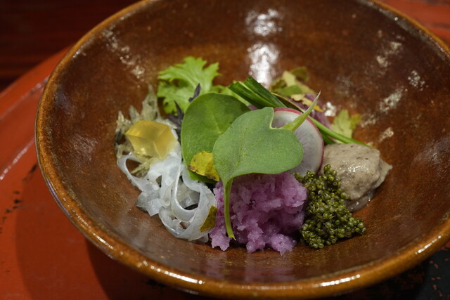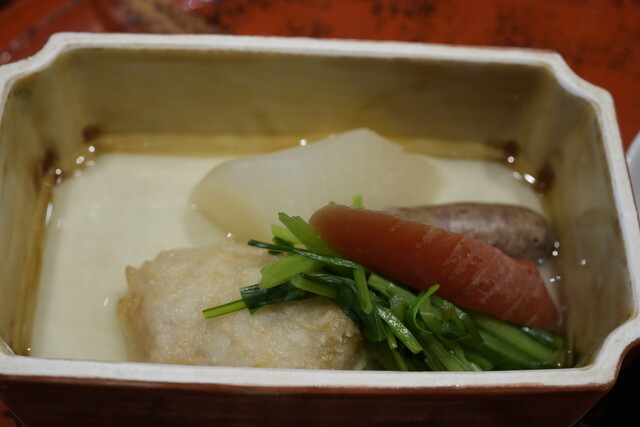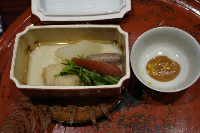 特筆すべきは、「冬至の無病息災」にちなんだ一皿。赤かぶらをおろした鮮やかな一品に、南瓜、小豆、そして柚子の絞り汁。氷餅を散らして「初冠雪」を表現した演出には、おおっ!って感じでした。