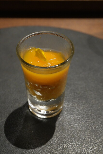 2皿目: 桃のスープ、アマゾンカカオ(ホワイトチョコ)、リコッタチーズ。完熟梅と蜂蜜、ティムールペッパー、ジャスミンアイス。