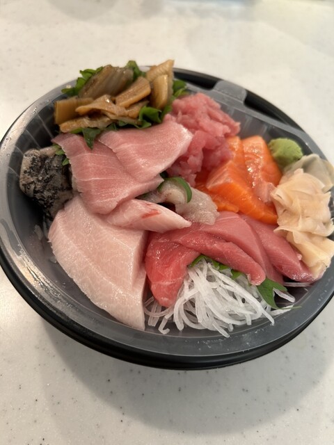 近くで飲んでるのでゆっくりでいいですよと言い30分ぐらいして取りに伺うとまぐろメインの立派などんぶりが2つ出来てるじゃないの
