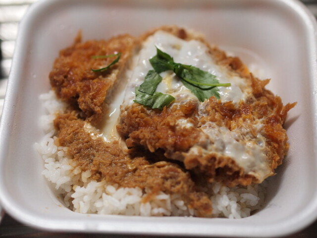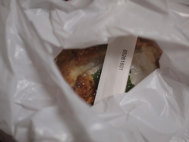 これがポリの透明の蓋が実に密着度が高く,これなら傾けて汁(つゆがあればの話ですが)が漏れる心配もなく,調理後1時間にしてややご飯がたれを吸って固くなりつつあるものの,とんかつの旨さはやはりただものではなく。