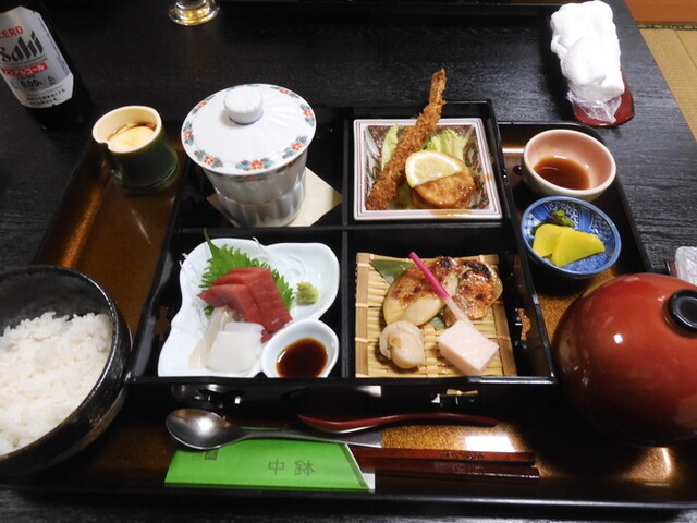 刺身、フライ、焼魚をメインにまぁ茶碗蒸しに煮しめ、漬物、さらにはデザート、珈琲まで。