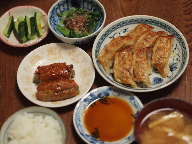 夕食はウジエの餃子と炙り野菜のつくね巻き。