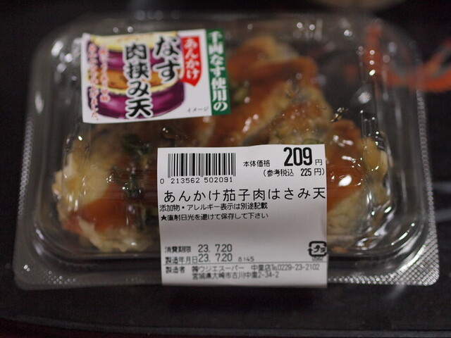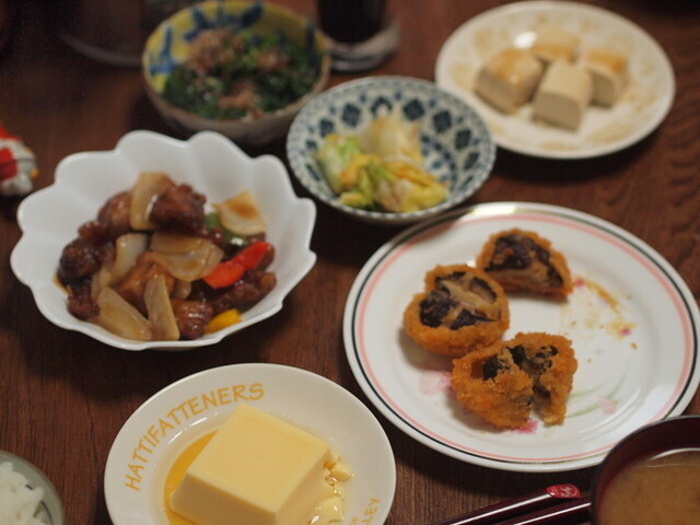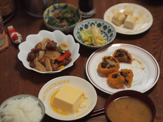 夕食のメインはあんかけ茄子肉はさみ天と酢豚、ウジエスーパーの惣菜です。