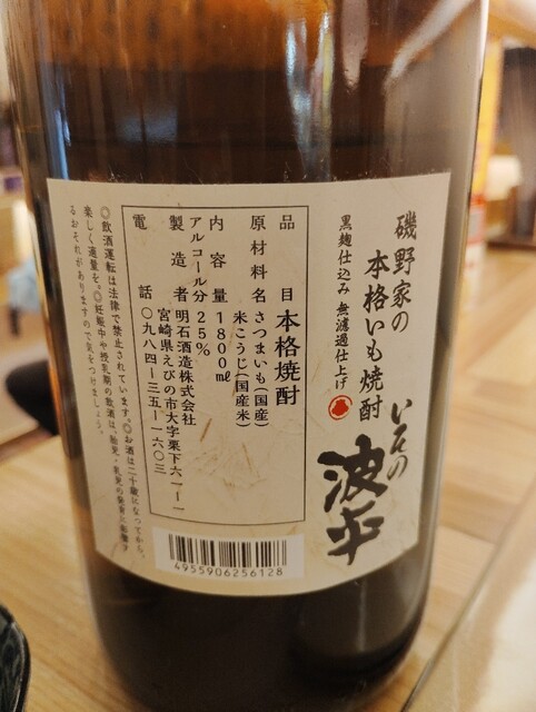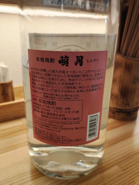 せんべろセット1000円で始めましたが、、済むわけは有りません。宮崎焼酎、、関東の人間からすると見たことないものばっか、、磯野波平と萌月を頂きますが、両者、芋(種類は違いますが)ベースの焼酎で、、旨いのは確かでした。