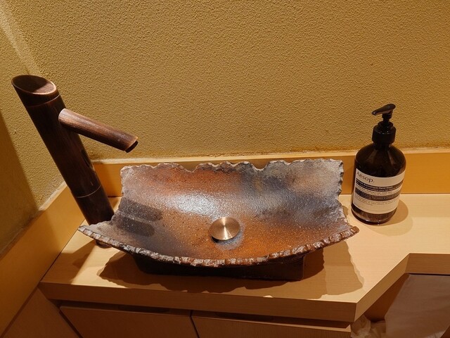 ご飯はお代わり自由なので、2杯目は玉子かけご飯にして頂きましたが、こちらも美味しかったですね。岩塩はプッシュ式の変わったギミックな容器、玉子掛けごはん用のしょう油もスポイト式の変わった容器で、細かいところに拘っています。そうそう、お手洗いを借りたら、ハンドソープはイソップでした。細かいところにも拘っていますね。