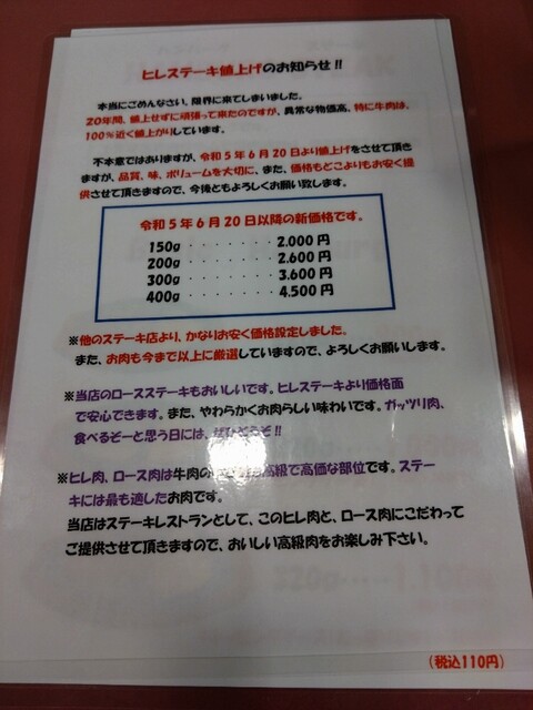 ヒレステーキ値上げのお知らせ (꒪⌓꒪)ガーン