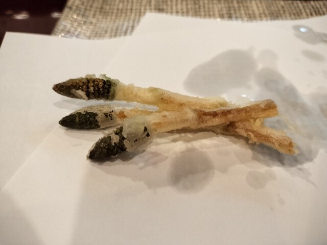 順に、車海老(小巻)、アオリイカ、フキノトウ、菜の花、博多蕾菜、つくし、ワカサギ、ホタテ、甘鯛の昆布締め、金目鯛・・・以上