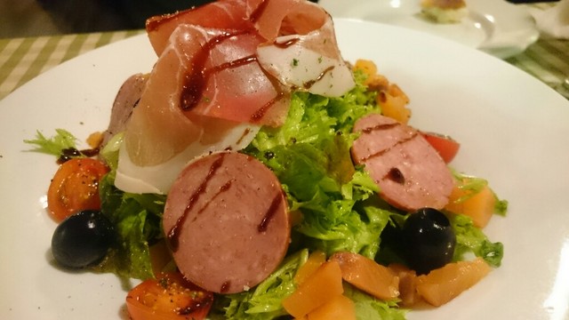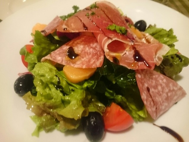 葉っぱ系の他に、オリーブ、フルーツ?トマト、サラミ、生ハム、スモークサーモン