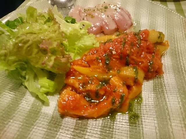 スペイン黒オリーブ、鮮魚のカルパッチョ、イタリア産生ハム、鶏白レバーのパテ、紅豚のローストポーク