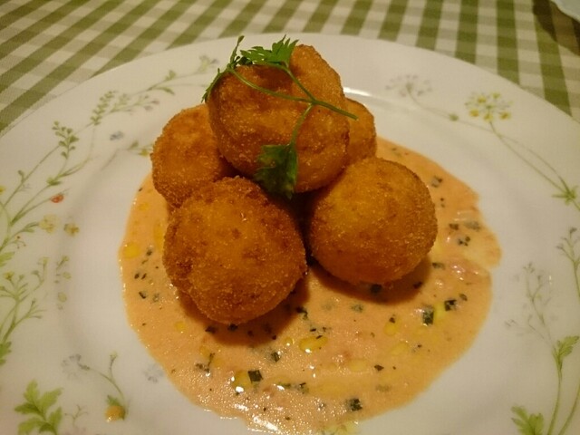 平たく言うと、ご飯とカニを混ぜて揚げたものです。