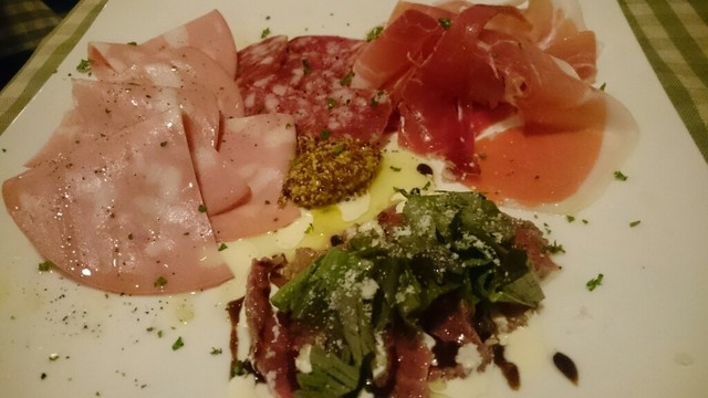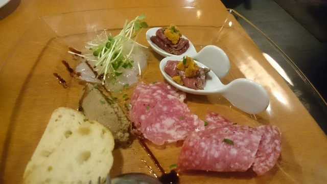 モルタデッラ、大仙鶏のマリネ、生ハム、パテ、鶏レバー