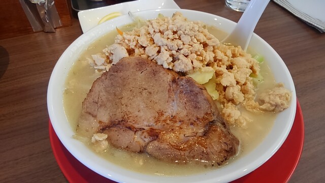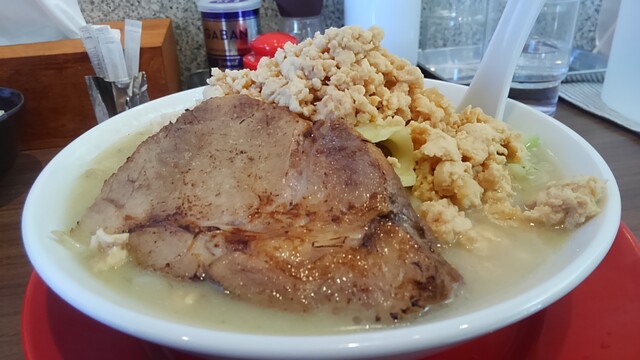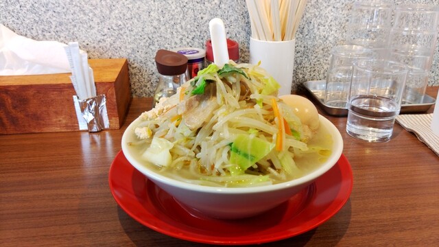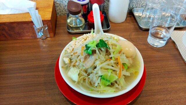 目の前に着丼した一杯、野菜増量ということで盛りが凄いことに。二郎系に引けを取らない炒め野菜が「ドン!」っと美しい盛り。濃厚鶏白湯やあっさりタンメンと違い、レモンや生姜は無しのシンプルな構成です。