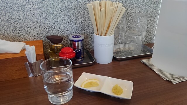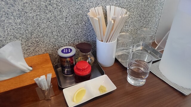 最初に別皿のレモン&生姜が到着、タンメンが来る間にカウンター前調味料やPOPなどを撮影して待ちます。