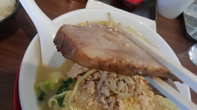 トッピングしたチャーシュー、分厚いのですが柔らかくて旨い、なのでスープに染みさせながら食べて行きます。また増量の粗挽きそぼろ、きちんとした味も付けてあって最高な具材です!