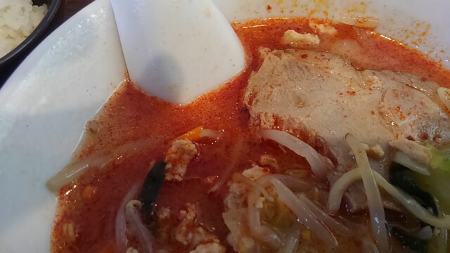 追い飯が若干多かったので、レンゲに掬ってスープを染み込ませて食べて行きます。辛いスープですが、ご飯も進みますね。