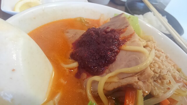 麺は中細麺、ちょっと柔目がスープに合ってます。チュルチュルと啜ると、スープが絡んで良い感じ。炒められた野菜は味付けもちょうど良く、そこにレモンを投入して味変、レモン好きな私はかじります。爽やかでラーメンにぴったり。