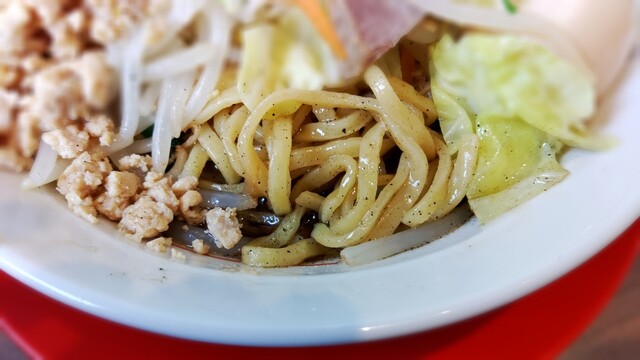ヤサイマシにしましたので、丼の上には炒め野菜が沢山!シャキシャキ感が堪らない。野菜たちのミネラルをスープに移すべく浸しつつ、その下に隠れてる麺を掬って食べていきます。カタメに茹でられているのでコシがまた堪らない。