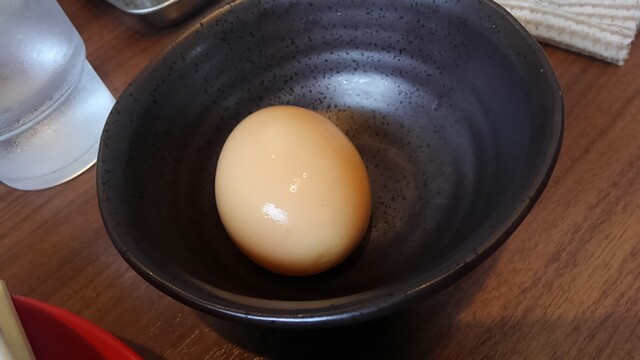 サービスの味玉はしっかりと半熟っており美味しいです。具も麺もしっかりと食べての完食です。