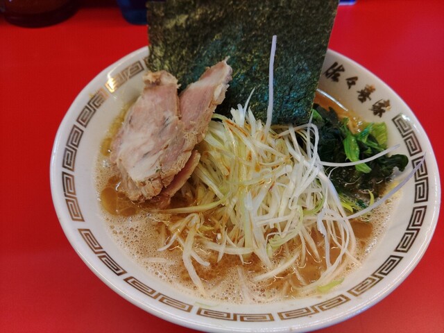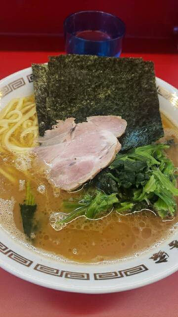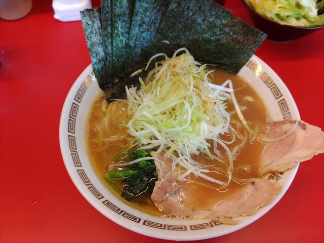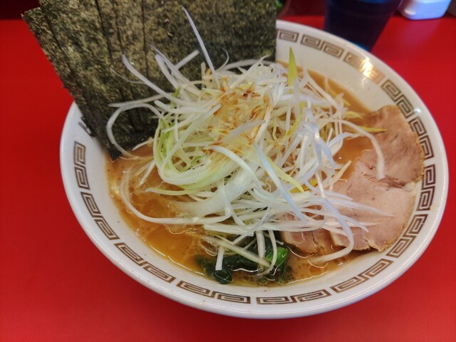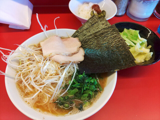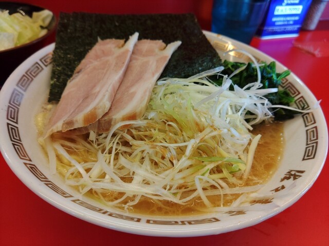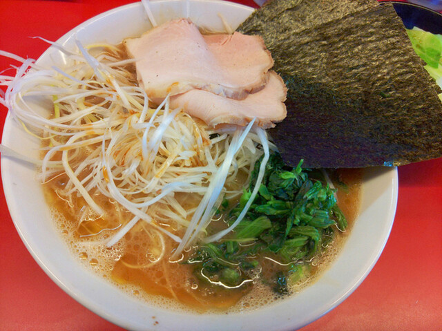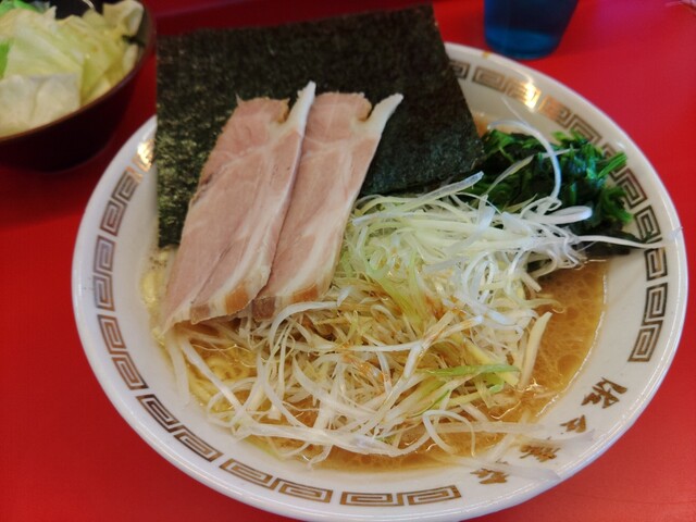 白髪葱やホウレンソウ、5枚の海苔、そしてチャーシューも沢山。中盤に卓上のニンニクと豆板醤を入れての味変化も楽しみました。