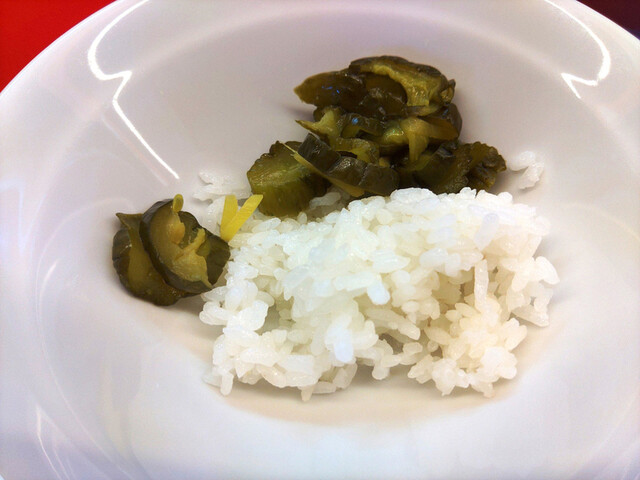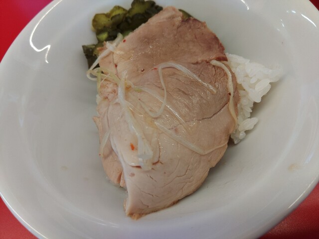 そして無料のライスがこの御時勢で有難い、食べられる少しだけの量とキューちゃんをもらい、ラーメン着丼後にチャーシューを載せて、ラーメンスープかけて食べました。