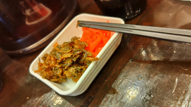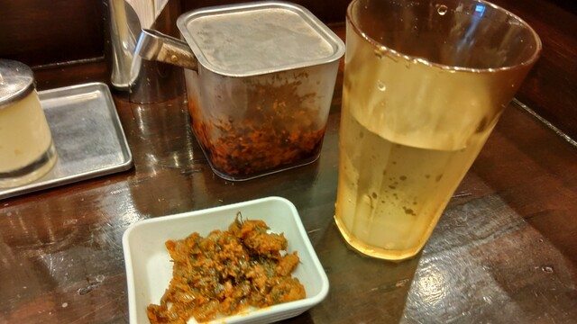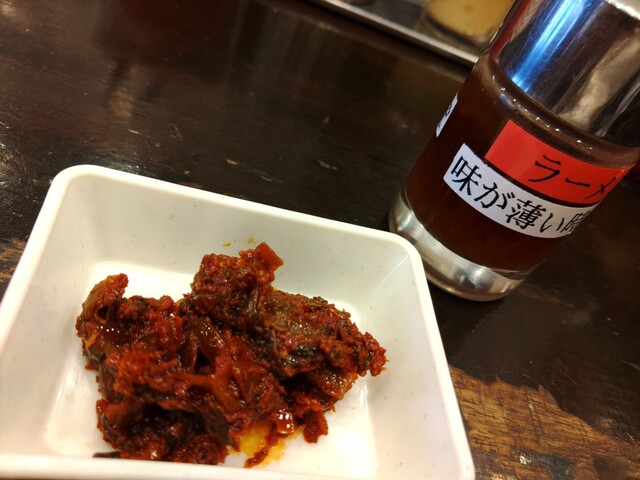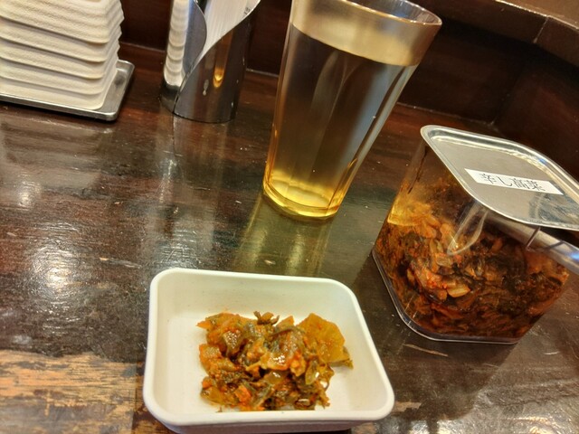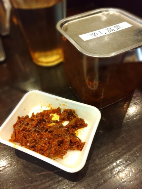 待つ間に辛子高菜をもらい、小皿に取り卓上のラーメンタレを付けて食べながら待ちます。これマイブーム。