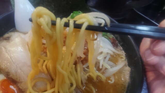 麺を掬い上げますと湯気もうもう!そして麺のカタさは指定しなかったですが丁度よい固さです。太麺に濃厚スープが絡みつき、これ絶対にリピートあり。