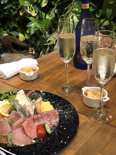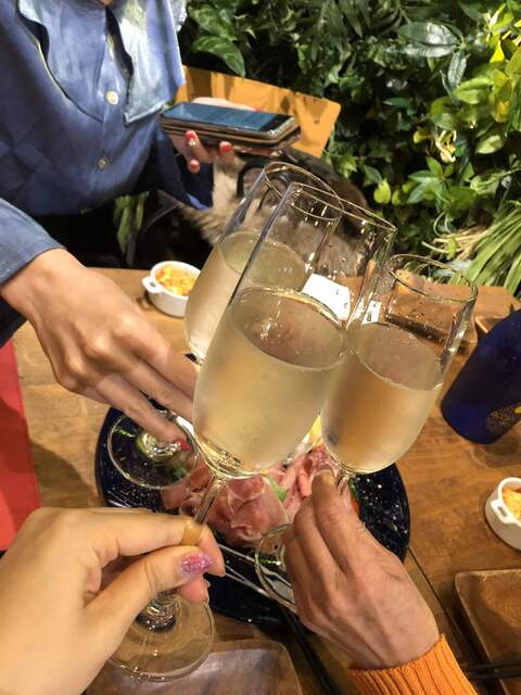イタリアンスパークリングで乾杯。ボッテガアカデミアブルーというおしゃれな銘柄は写真ばえします。