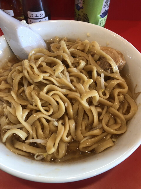 土曜日の11時ちょうどに来訪。並びは10人。ギリギリ店内で待つ事ができました。食券を買って椅子に座り待ちます。先の人が食べ終えた頃に先に食券を求められるので渡して待ちます。カウンターが空いても勝手に座るのはNGです。ちゃんと呼ばれてから座りましょう。お店に来てから30分弱くらいでカウンターに座れました。麺が茹であがったらコールタイム。私はニンニクをコール。あとはそのままです。そのままだと野菜量は少なめです。増し、ちょい増しもできます。まずは野菜から。スープを野菜にかけるととても美味^_^シャキシャキなもやしに豚の旨みが加わりとても美味。スープは非乳化の醤油がキリッと効いたスープ^_^かなりしょっぱ目ですがとても美味^_^卓上のタレを使う人いるのかな?そのままでもかなりしょっぱいです笑。豚は厚めなのが2個。1つは普通の丸いチャーシュー。2枚目は端っこかな?この端っこのがとってもホロホロで柔らかく味も染みててとっても美味^_^豚1枚だとこちらの端っこは付いてこないかな?そして麺です。今日はすこーし柔めでしたがワシワシ感は健在^_^厚めの太い麺です。これくらいゴツい麺だとむしろこれくらいの茹で加減のが良いのかも。麺を持ち上げた感じ300gもあるようには感じなかったのですが、1本の麺がゴツい為そう感じるだけみたいです。食べ進めるとかなりお腹いっぱい笑。私には中が美味しく食べられる量でした。