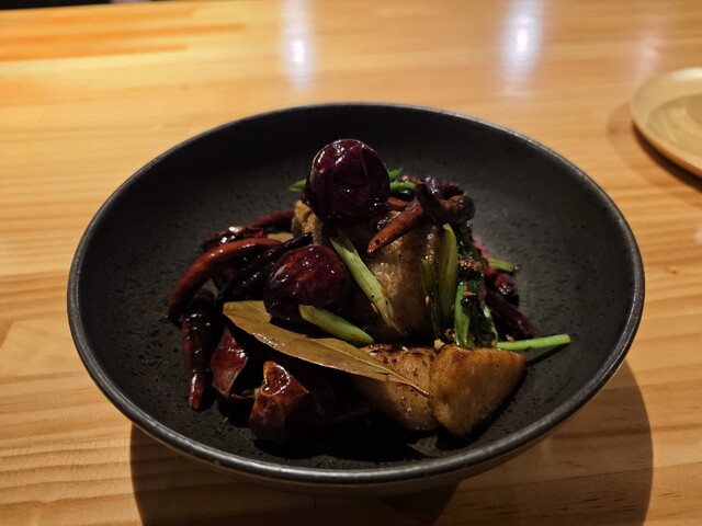 栗の渋皮揚げから始まり、厚岸産あさりの紹興酒漬け、5日間熟成のソイ、北海道産クワイのシュウマイ、月光百合根の天ぷら黒酢ソースと続きます。どれも丁寧で、土地の食材への誠実さが伝わる。