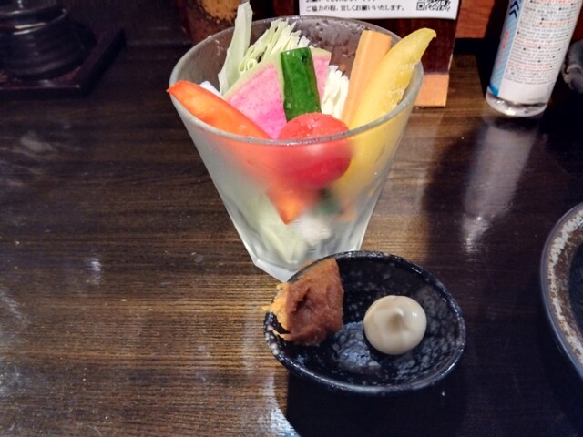 お通しはキャベツ、にんじん、だいこん、ミニトマト、パプリカなどの生野菜です。