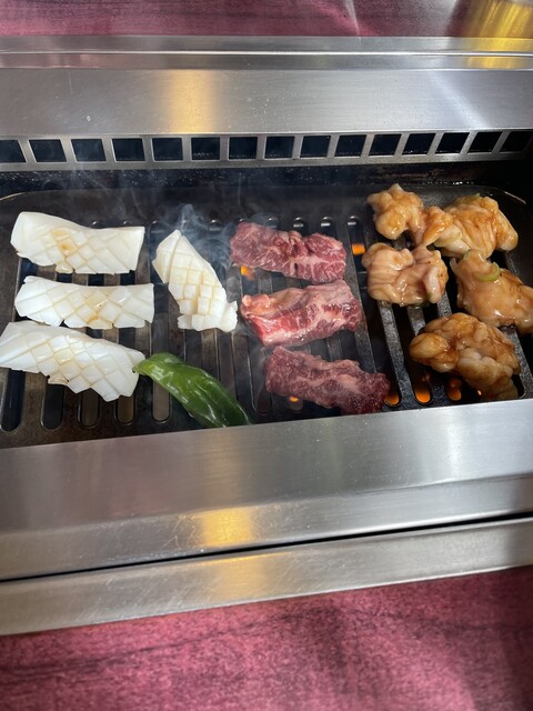 カルビ、ホルモン(国産牛よ!)、イカ、野菜、キムチ、