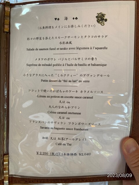 ランチメニュー❶→今回はコチラをチョイス グラスワイン(赤)もオーダーしたため 【合計】2,450円税込