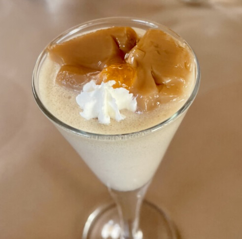 ▶︎小グラスに入ったミルクティーのアヴァンデセール 卵白を泡立てたミルクティーテイストのメレンゲで 軽くクチ直し