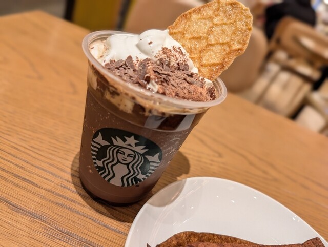 夜の図書館で味わう、大人の贅沢カカオフラペチーノと濃厚タルト