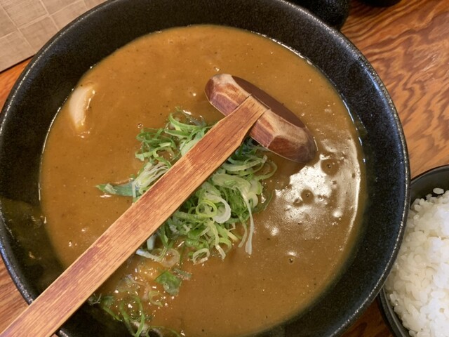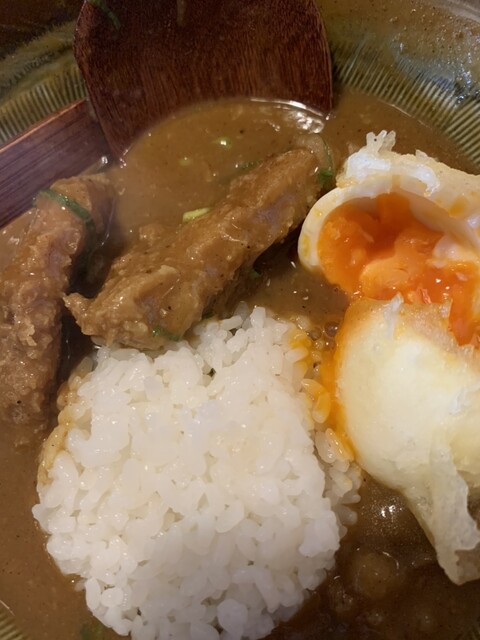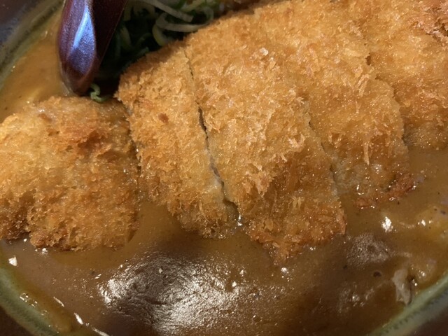 隣の刈り上げ頭にキャップから2本の三つ編みが垂れている後客のお兄さんが、うどん前に卵かけご飯を完食していた。心の中で「もったいな」と思いながら、なんちゃってカレーライスを食べる中身。。