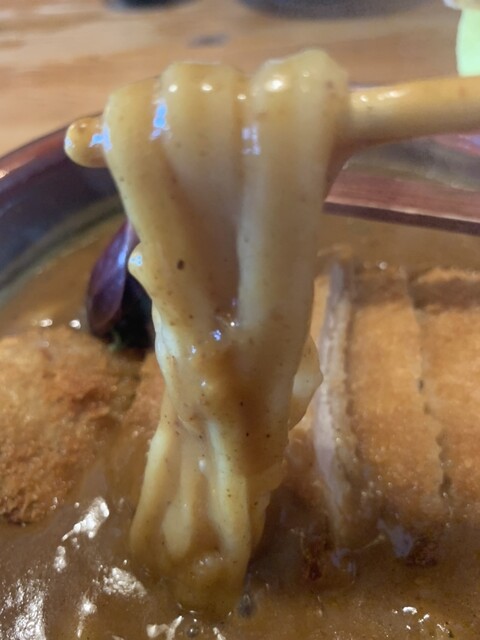 極太手打ち麺に深みのあるカレー汁。さらに熱々のトンカツにお肉とおネギ。まるで丼鉢の中がアミューズメント施設のようで、飛び込みたい。