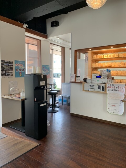 オミセに入ると左側にレジカウンターがあり、その後ろにはズラッと美しい食パンが並んでいる。