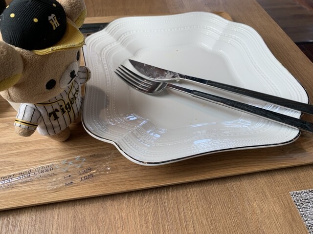 ってなっている所謂外側が、全て白い。ナイフとフォークで1枚バターをカリカリしながら表面に押し広げる。切り込みの隙間に入って行き、至高のバタートーストが完成する。無心で食べ続ける中身。は始終笑顔だったらしい(パパさん談)。