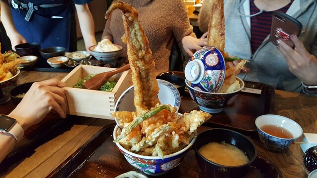 丸々一匹の穴子の天ぷらが、どんぶりにぶっ刺さっています(^^)