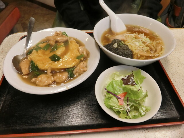 鶏ももとフワフワ玉子の餡かけ丼と小ラーメンです。