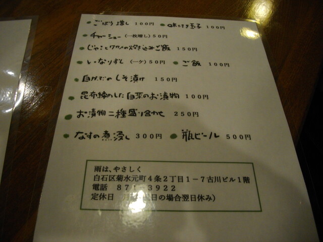 塩分丁度。「雨やさ」お得意の「ごぼう」が揚げたものはサクサク、煮たものは良い味付け。