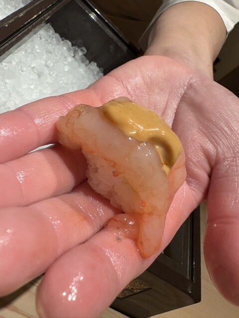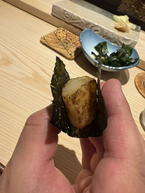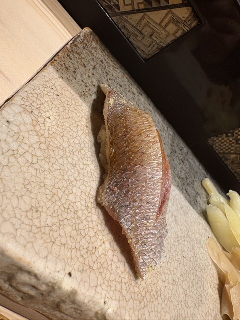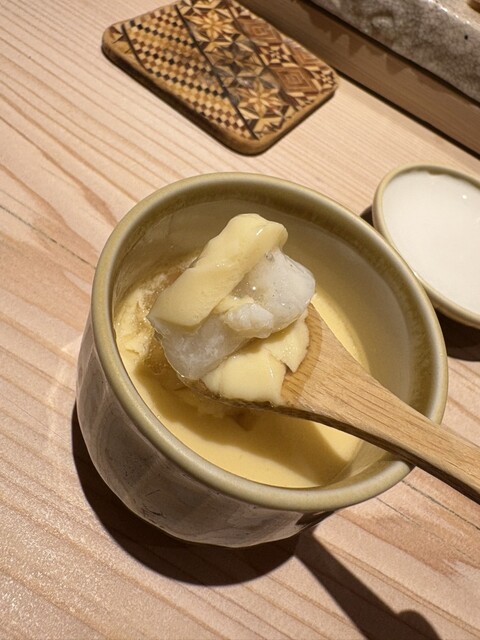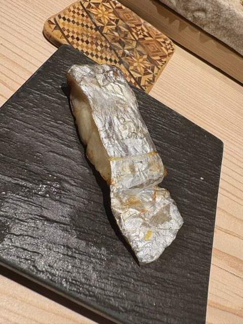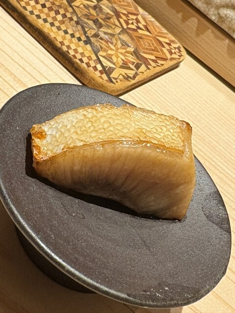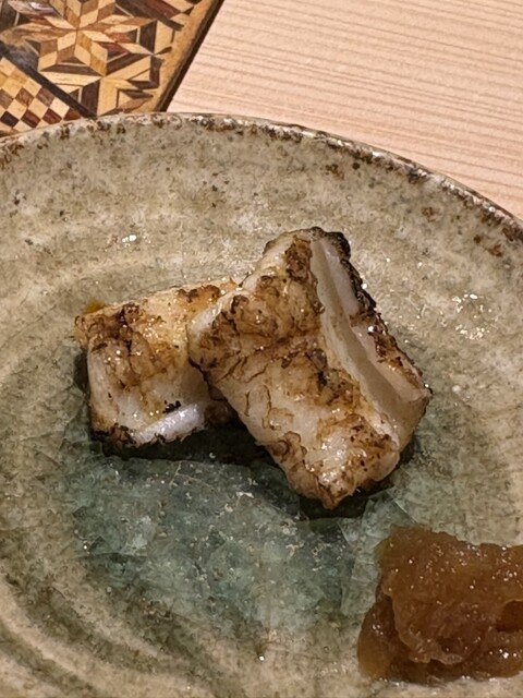 温菜のたらの白子は、シャリの上に白子の焼き周りは裏漉しした白子とを鰹出汁で解いたものですが、白子やシャリが美味しいのは名店としては当然ですが、鰹出汁が秀逸。しっかり印象を残しつつ白子とシャリとマリアージュされてました