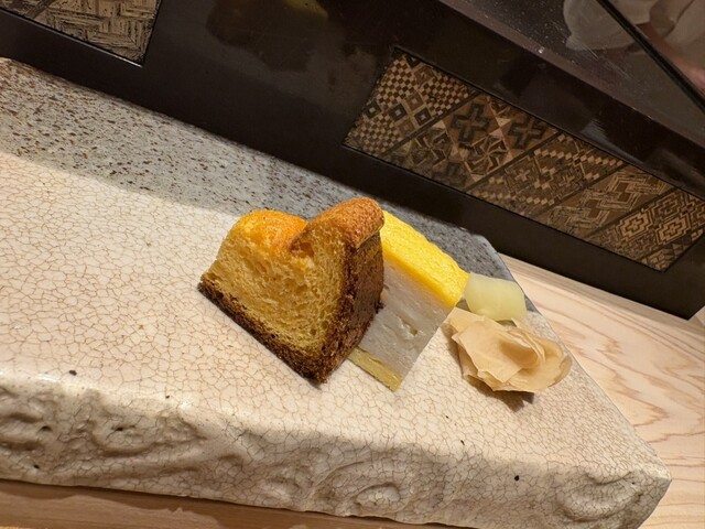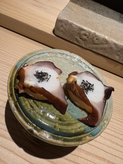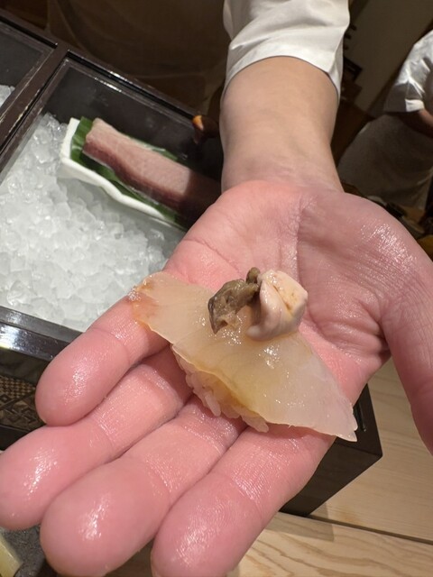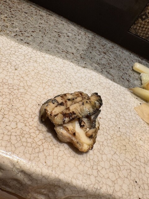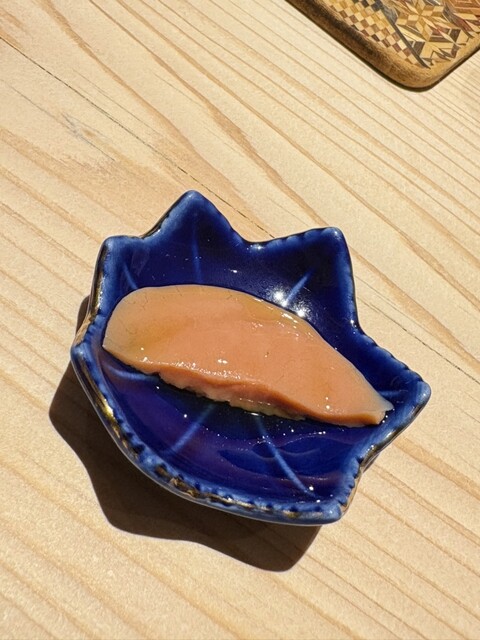 カワハギ(握り)生の肝と煮た肝 食感が楽しめます。何よりカワハギ、そんなに肉厚に切って良いの?というサイズでなかなか食べられない贅沢さ。一貫で高価さを味わえる!?