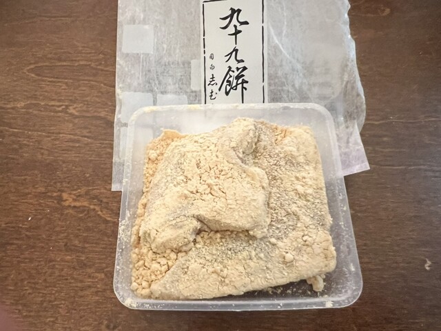 目白に用事で目的地に向かう途中、九十九餅の文字の老舗和菓子屋さんがあり気になり用事を済ませた帰りに寄ってみた。何かをきな粉にまぶしてあるお菓子。興味深いので個包装の2個入りを購入。きな粉にまぶされていたのは、求肥。そして豆も入っている。きな粉は甘く無くいいバランス。このお菓子は初めて食べた。また食べたくなる美味しさ。