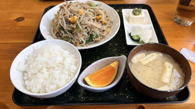 鳥皮・もやし・ニラ・ゆで玉子のキミ?の中華炒めです。