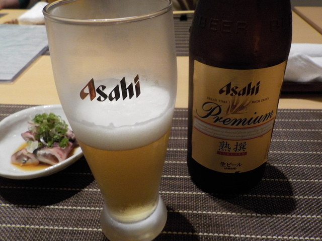 お通しのやり烏賊酒蒸しをあてにビールで乾杯。こちらのお店ではアサヒなんですね。サッポロが主流かと思ってました。(*´ー`*)