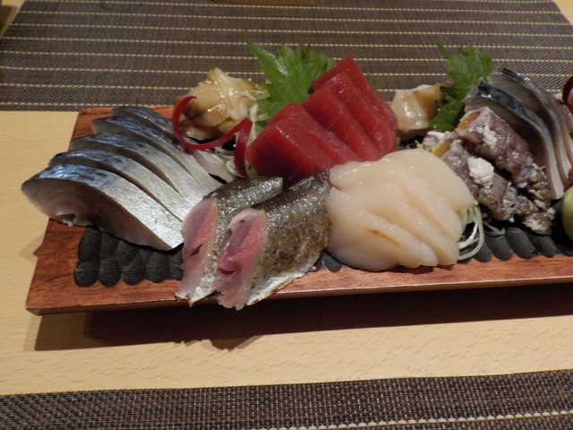 本マグロ・炙り秋刀魚、北寄貝・平貝・〆鯖・シャコ貝・サーモンが盛り合されていて、4-5人前充分です。