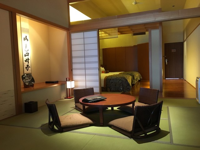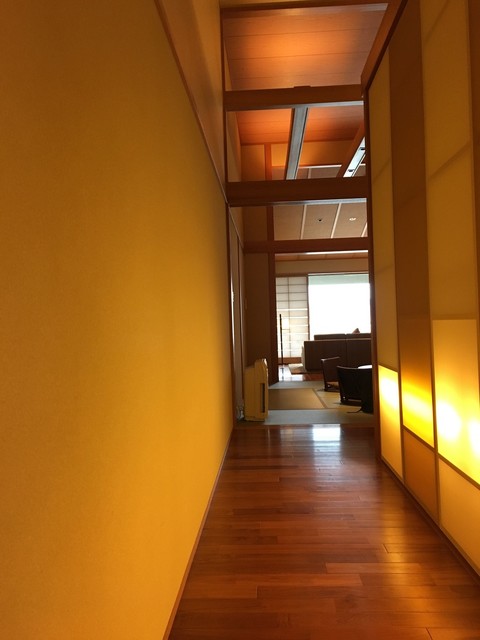 部屋は、ベッドルーム・和室・リビングルーム・温泉浴室スペースから構成されていてます。何より驚かされたのは天井の高さ。これが広々とした空間をつくりだしていました。