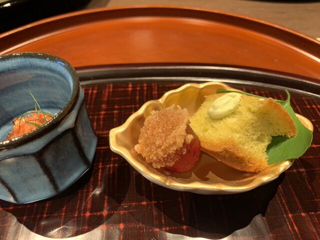 ・前菜盛り合わせ・・・2名分を一緒盛りにされた皿には彩とりどりの猪口に入れられた前菜の品々。鰻の一口寿司あれば、合鴨燻製をラタトゥーヤ風にしたものや、枝豆のカステラまで。和食といいながら、なかなか面白い前菜盛りで、目でも楽しめました。
