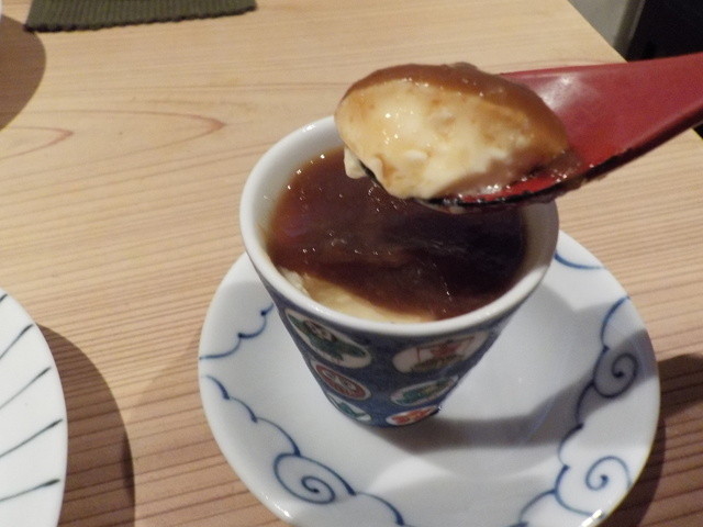 まずは、ちっちゃいお猪口型の器に、シラスと梅肉の茶碗蒸し。ちょっとだけジュレがしょっぱかったが梅がいいアクセントになっていた。